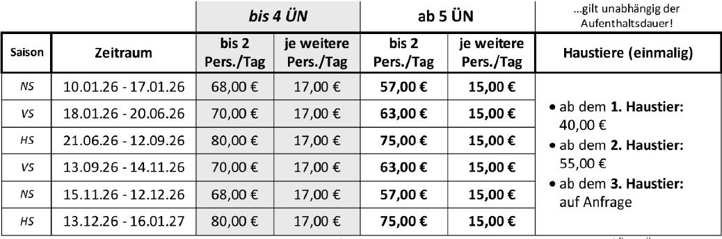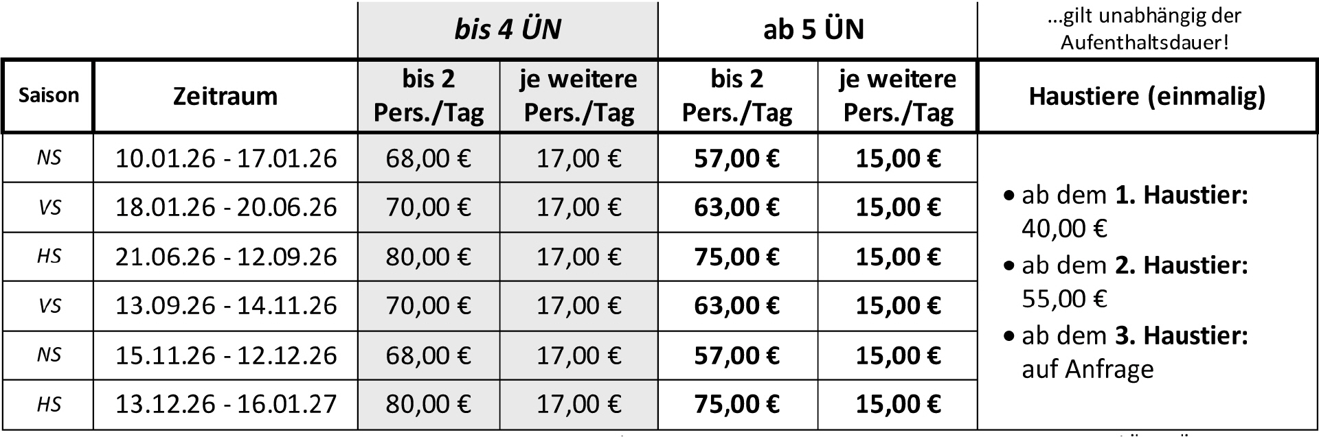 >> Bitte beachten Sie: Es gelten immer die aktuelle Tarif/Preise, Gebühren (z.B. Kurtaxe, Strom etc.), etc. zum Zeitpunkt des Aufenthaltes!!!